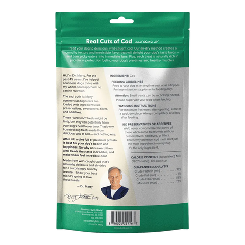 Dr. Marty Cod Cracklers is a tasty and wholesome dog treat made from 100% air-dried wild-caught cod that delivers a crunchy texture and natural flavor dogs love. Gently air-dried (rather than highly cooked), these treats help preserve more nutrients and protein, making them a great choice for rewarding good behavior, training, or just spoiling your pup with something healthy and delicious.