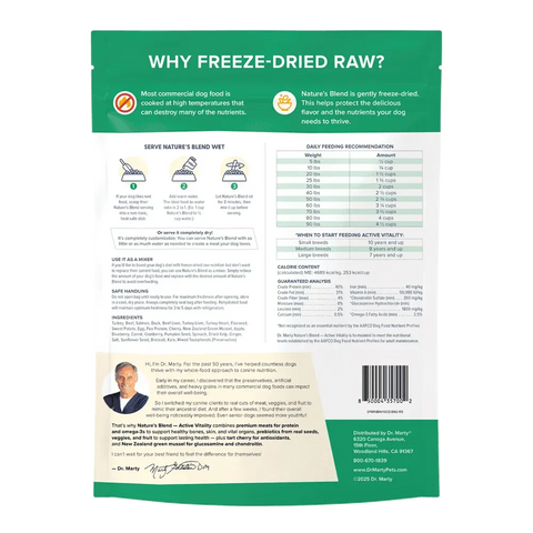 Dr. Marty’s Active Vitality Recipe is a premium freeze-dried raw dog food crafted to help senior dogs (typically ages 7 and up) stay active and vibrant as they age. It blends high-quality meats with nutrient-rich fruits, vegetables, and superfoods to support overall health without artificial preservatives or fillers. This recipe is designed to nourish aging dogs with balanced nutrition that promotes digestion, joint mobility, immune health, and sustained energy